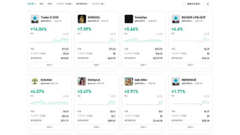 Bitgetの目玉機能といえばやはりコピートレードだ。実績のあるトレーダーの取引を自動で追いかけてくれる仕組みで、収益率やフォロワー数といった指標を見ながら選べるため、誰に乗るかの判断がしやすい。「自分ではまだ先物は不安だけど、うまい人の戦略を学びながらやってみたい」という入口としても使える機能である。
