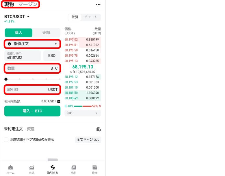 現物取引は、USDT建ての取引ペアを選んで成行注文か指値注文を入力するだけだ。注文が通ったらウォレットの残高に反映される。