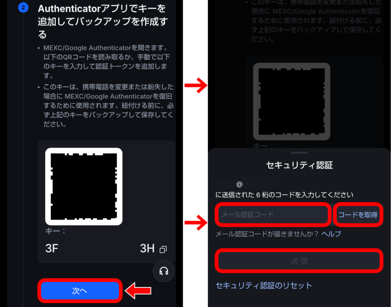 「MEXC/Google Authenticatorを紐付け」の画面が表示されたら下にスクロールして、QRコードを読み取るか、キーをコピーしよう。