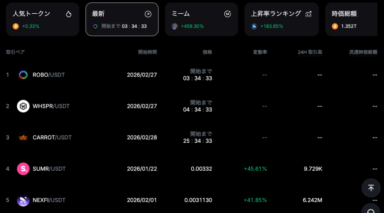 MEXCの最大の特徴は、とにかく扱える銘柄の多さにある。メジャーどころはもちろん、新興プロジェクトの上場が他取引所より早い傾向があり、「まだどこにも上場していないトークンがMEXCにはある」というケースも珍しくない。