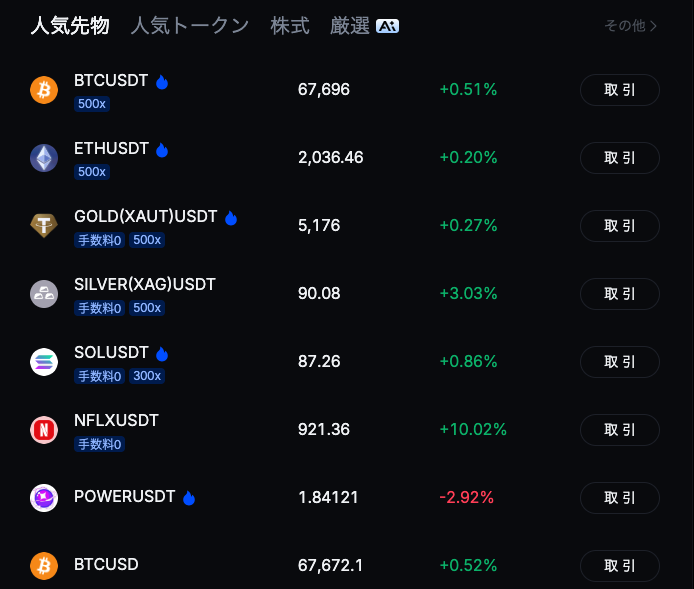 | 先物取引 | USDT無期限等 |