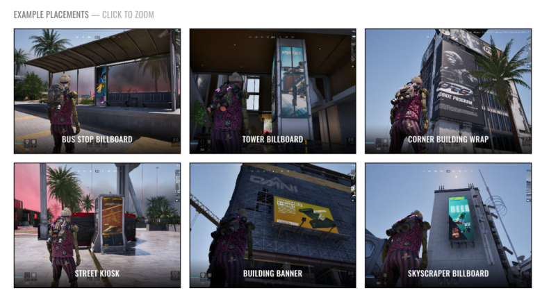 入稿されたアートワークは、Off The Gridのサイバーパンクな世界観に合わせてスタイライズされる。広告の掲出先はゲーム内のビルボード、キオスク、建物ラップなど複数の枠が用意されており、キャンペーンの目的に応じて選べる。