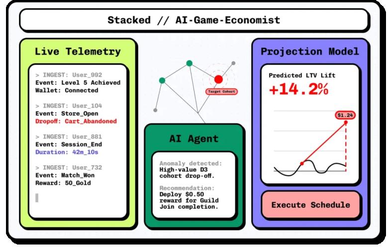「Stacked」は、プレイヤーの行動をリアルタイムで読み解き、一人ひとりに最適な報酬を提案するAI基盤だ。SDKを通じてゲーム内データを収集し、「このプレイヤーは離脱しそうか」「課金に動く可能性はあるか」をAIが予測しながら、インセンティブの中身と届けるタイミングを決めていく。