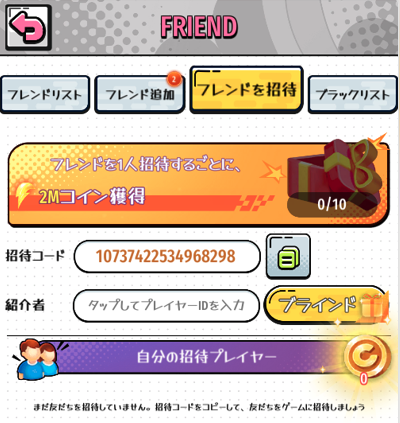 招待コードはゲーム画面から確認することができます。
