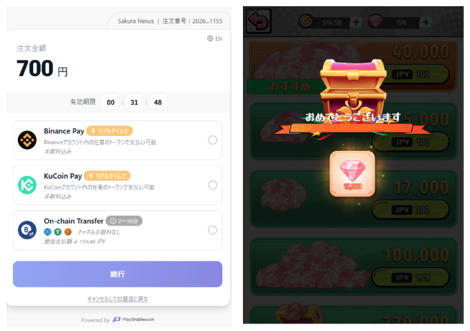 海外ユーザーの皆様向けには、Binance PayおよびKuCoin Payにも対応しました。決済はほぼ即時に反映され、完了後すぐにHANAトークンがアカウントへ付与されます。