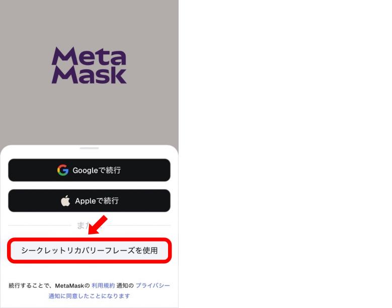 次に、シークレットリカバリーフレーズを使うか、GoogleまたはAppleアカウントと連携するかの選択画面になる。