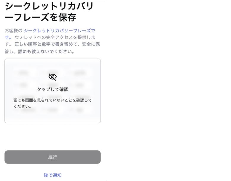 ここでは、シークレットリカバリーフレーズを選ぶ方法で説明する。ちなみに、Apple/Googleアカウントで連携した場合は、シークレットリカバリーフレーズは画面に出てこないので注意しよう。